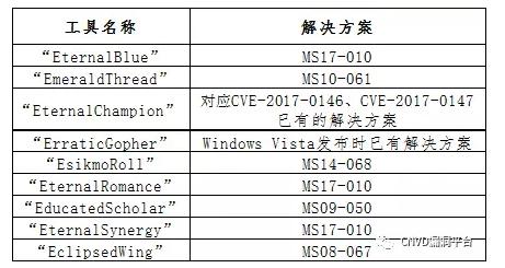 根据微软官方发布的声明称,上述表项中涉及的大部分漏洞已在微软支持的产品中修复,微软官方公告的解决方案对应表如下表所示。